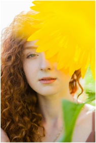 A captivating portrait of a woman with curly hair partially obscured by a sunflower in a sunlit outdoor setting.