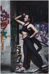 A fit woman in sportswear poses by a vibrant graffiti wall, showcasing strength and style.