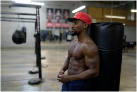 Fit, shirtless man with tattoos leaning on punchin