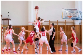 Exciting women's basketball game in a school gym,