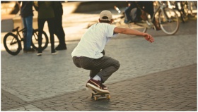 Young man skateboarding outdoors, showcasing actio