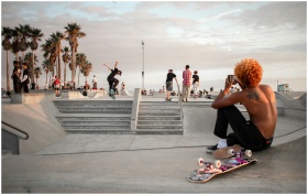 Energetic skateboarding action during sunset at Venice Beach Skatepark, Los Angeles.