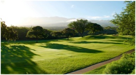 Serene view of a lush green golf course surrounded by trees and mountains, bathed in sunlight.