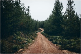 A tranquil dirt road meanders through a lush green conifer forest, conveying a sense of peace and adventure.