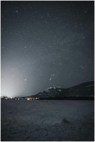 A breathtaking view of a starry night sky over a snowy mountain landscape during winter.