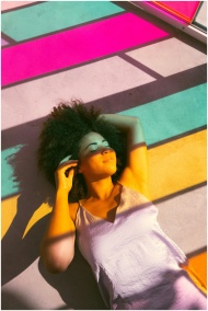 Woman relaxing on a colorful sunlit floor with shadows creating vibrant patterns.