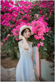A beautiful woman wearing a white dress and hat stands amidst vibrant pink flowers in an outdoor garden.