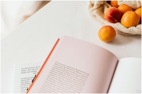 From above of opened book placed on white table near cotton sack with natural ripe apricots