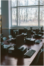 Spacious computer lab with rows of monitors and ke