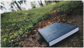 A hardbound book on a grassy outdoor path in a gar