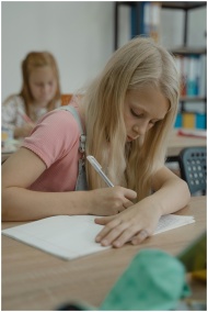 Blonde girl attentively taking notes in a classroo