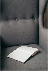 An open book resting on a gray armchair, showcasin