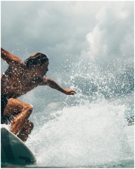 Energetic surfer rides ocean waves in tropical Indonesia, capturing the thrill of water sports.
