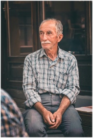 A senior man in a plaid shirt sits pensively outdoors in Bolu, Türkiye.