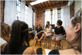 Women engaging in a panel discussion in a modern office setting, fostering an inclusive business community.