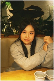 Young woman in a cozy café setting with a warm atmosphere and green plants.