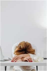 A tired woman with red nails resting her head on a