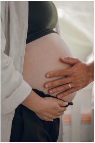A pregnant woman is tenderly touching her belly with a man's supportive hand.