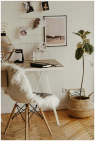 A stylish home office with a furry chair, sleek desk, and minimalist decor, creating a cozy and productive workspace.