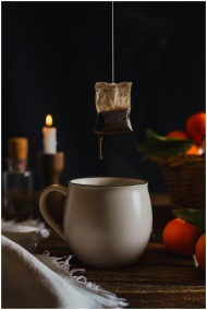 A tea bag freshly steeped in a ceramic mug, surrounded by cozy elements like candles and oranges.
