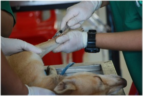 Close-up of a veterinarian injecting a dog with ca
