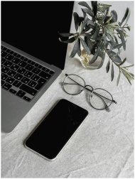 Flat lay of a laptop, smartphone, glasses, and pla