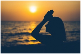 Side view of unrecognizable female with raised arms standing on seashore against sundown sky and doing yoga