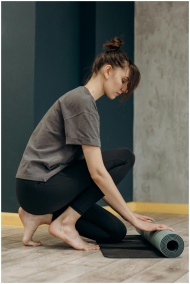 Woman setting up her yoga mat indoors, ready for a