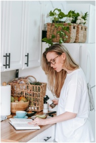 A woman multitasks in a kitchen, reading a book and preparing food on a countertop.