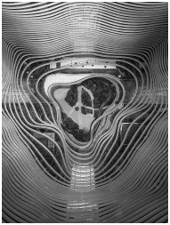 Aerial view of a futuristic steel structure showca