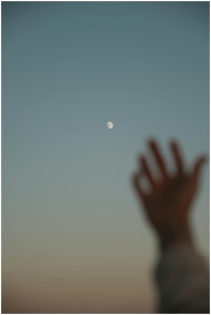 Hand reaching towards the moon in an evening sky, symbolizing aspiration and dreams.