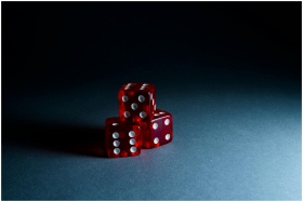 Three red transparent dice stacked on a dark surface, highlighting their reflective surfaces and dots.