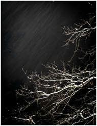 Eerie night scene with snow-covered branches silhouetted against a dark sky.