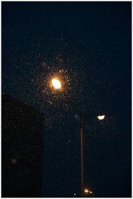 Moody city night scene with street lamps lighting up raindrops, creating a dramatic urban atmosphere.
