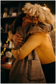 Two women hugging warmly indoors surrounded by festive lights.