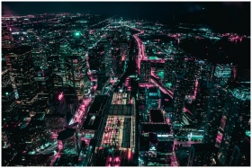 A stunning aerial view of Toronto's illuminated cityscape at night, showcasing vibrant lights and skyscrapers.