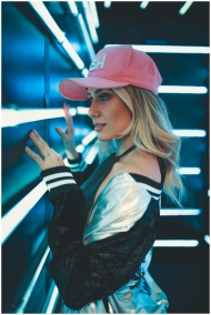 A fashionable woman poses in a vibrant, neon-lit corridor wearing a pink cap.