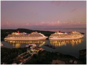 Two illuminated cruise ships docked at Coxen Hole, Honduras during twilight.