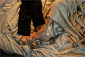 Close-up of a couple's feet intertwined on a cozy bed, expressing intimacy and warmth.