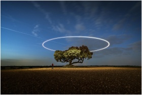 Drone light painting above a solitary tree in Guad