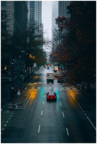 A rainy Seattle street with glowing lights at twilight creates a moody urban scene