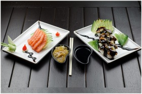Elegant display of Japanese sushi and sashimi on a