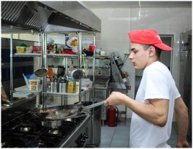 A young man working in a professional kitchen, coo