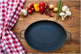 Empty cast iron pan with fresh ingredients on a wo