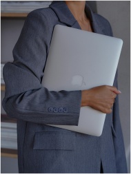 Professional woman holding a laptop in an office setting, expressing elegance and business professionalism.