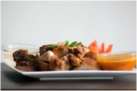 Savor this mouth-watering grilled meat platter with tangy sauce and fresh vegetables.