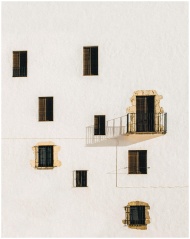 Minimalist architecture featuring a white wall with windows and shadows creating a dramatic effect.