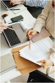 Top view of colleagues working together with a laptop and documents in an office setting.