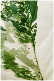 Macro shot of a variegated leaf showcasing its textured green and white patterns.