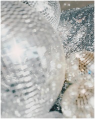 Close-up of shiny disco balls on a sequin surface,